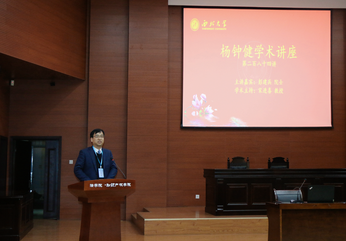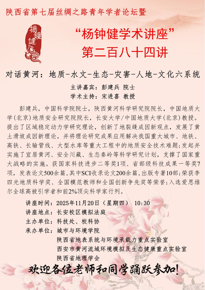 2025年11月20日(星期四)10:30,由我校科技处、校科协主办,城市与环境学院、陕西省地表系统与环境承载力重点实验室、西安市黄河流域环境模拟及生态健康重点实验室、陕西省地理学会共同承办的陕西省第七届丝绸之路青年学者论坛暨“杨钟健学术讲座”第二百八十四讲在长安校区模拟法庭举行。中国科学院院士、陕西黄河科学研究院院长,中国地质大学(北京)地质安全研究院院长,长安大学/中国地质大学(北京)教授彭建兵应邀出席,并作了题为“对话黄河:地质-水文-生态-灾害-人地-文化六系统”的学术报告。本次学术讲座由城市与环境学院宋进喜教授主持,西北大学党委副书记、纪委书记,陕西省纪律检查委员会、陕西省监察委员会驻西北大学纪检监察组组长肖道远出席并发表致辞,我院师生积极参与。
