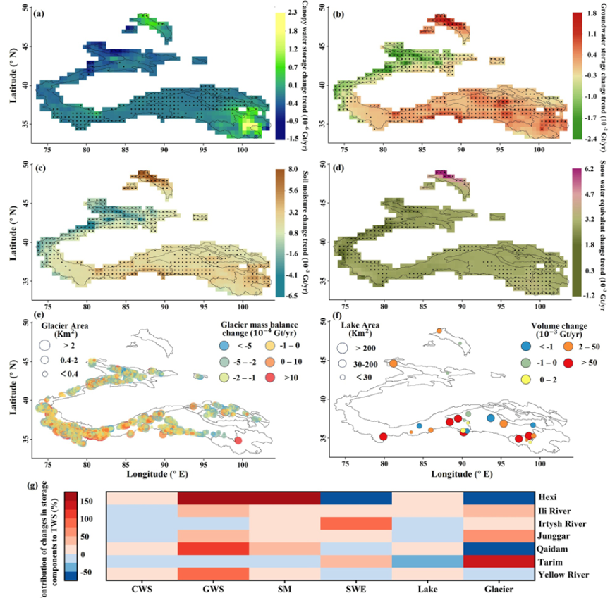 图3. 陆地水储量各组成部分的变化趋势及其贡献率。(a–f)陆地水储量各组成部分的变化趋势;(g)陆地水储量各组成部分对总陆地水储量变化的贡献率。SM,土壤水分;SWE,积雪水当量;CWS,植被冠层储水量;GWS,地下水储量;Lake,湖泊储水量;Glacier,冰川质量平衡。