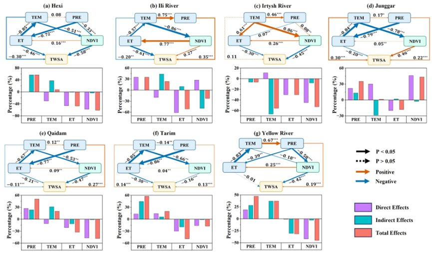 图4. 陆地水储量与驱动因素的结构方程模型。数字表示不同变量的贡献率。变量间的箭头表示因果关系。条形图呈现变量的直接效应、间接效应及总效应统计值。*P < 0.05;**P < 0.01;***P < 0.005。